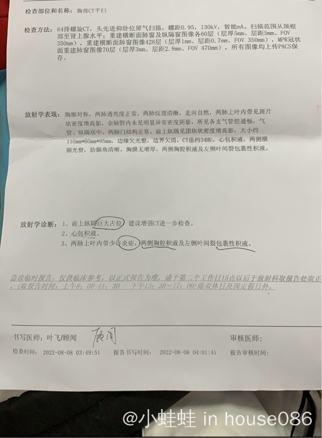 “前纵隔巨大占位,心包积液”,我一下子有点懵,看到“占位”这两个字,我就感觉肯定不是好东西,但是我当时对这两个字还没有很深刻的认识,后来才了解到这是令很多病友闻之色变,见之胆寒的两个字。再看报告上写着“纵隔高密度影,大小约110*60*95,边缘欠光整”,我已知大事不妙,赶紧跑过去找医生。