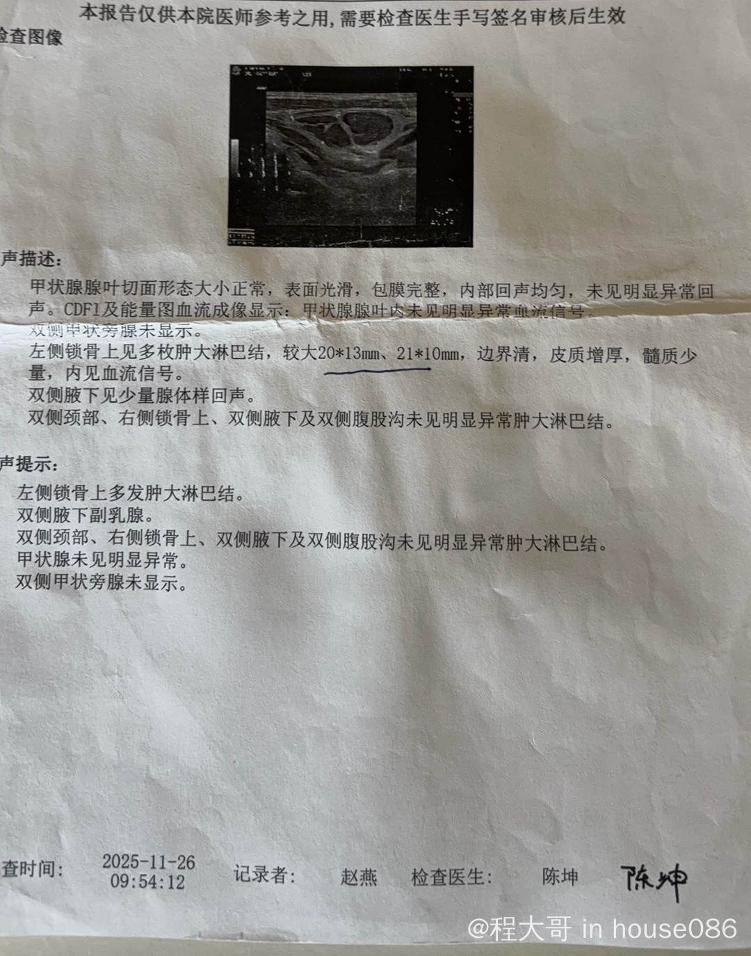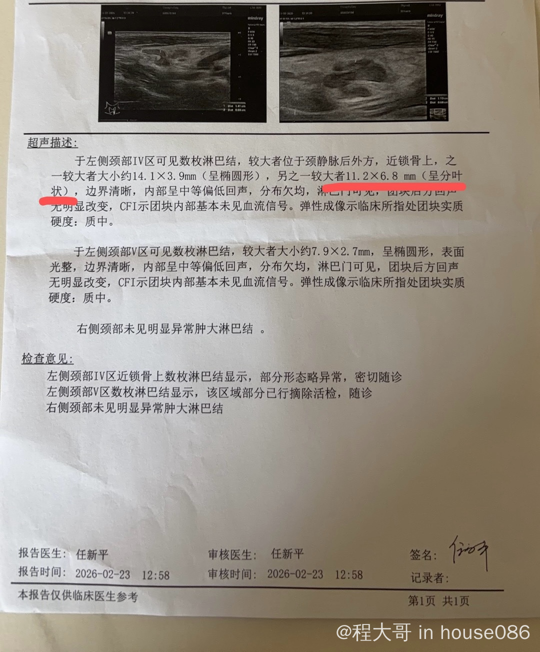 去年11月初自己摸到脖子淋巴结肿大,b超显示10mm,随访一个月后b超检查淋巴结增加到20mm。