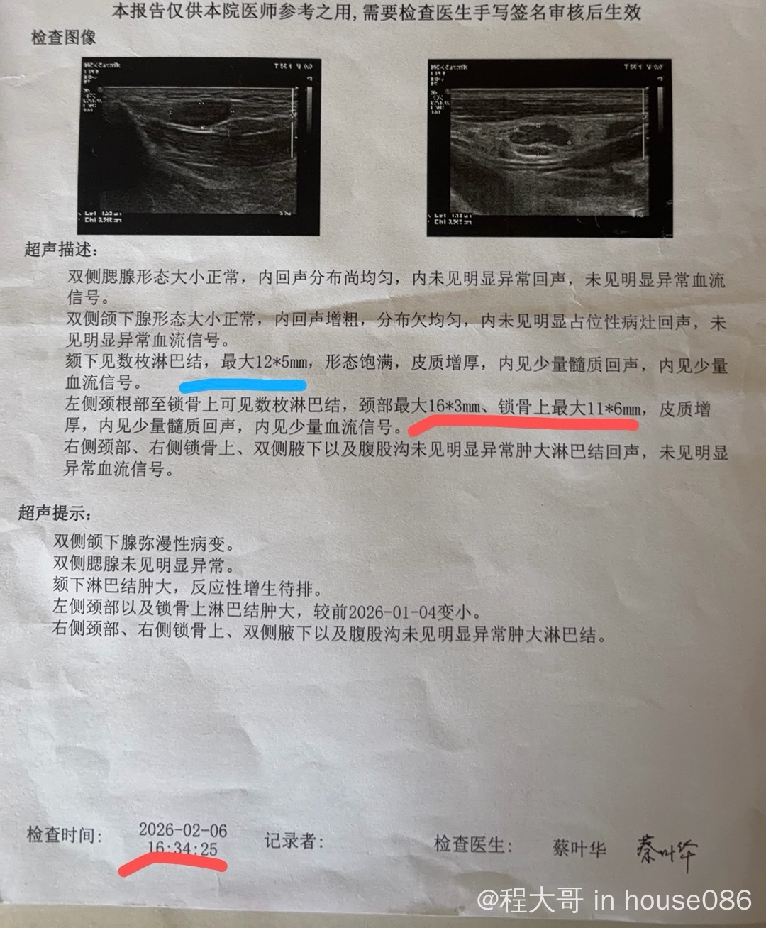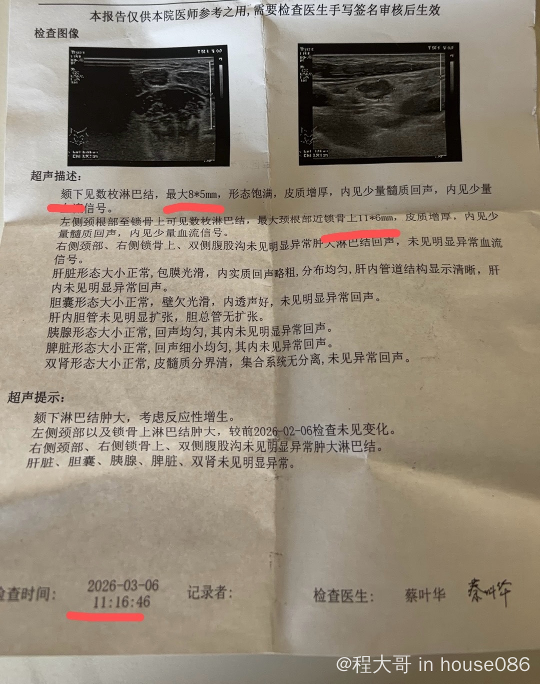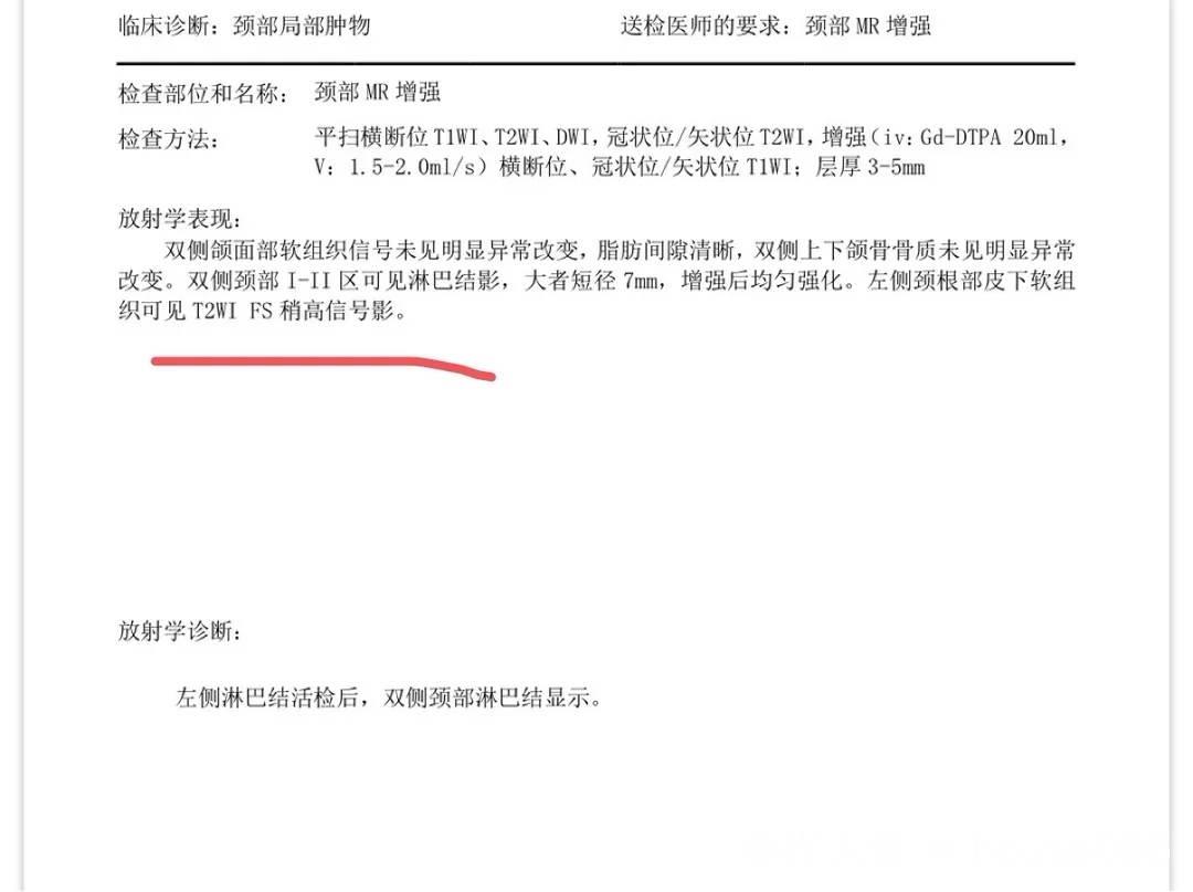 就一直在随访中。最近三个月b超随访脖子锁骨淋巴结未变大,形态有些还是不好。颏下发现淋巴结肿大,颏下观察一个月淋巴结有变小,医生说颏下可能是良性增生,让继续观察。