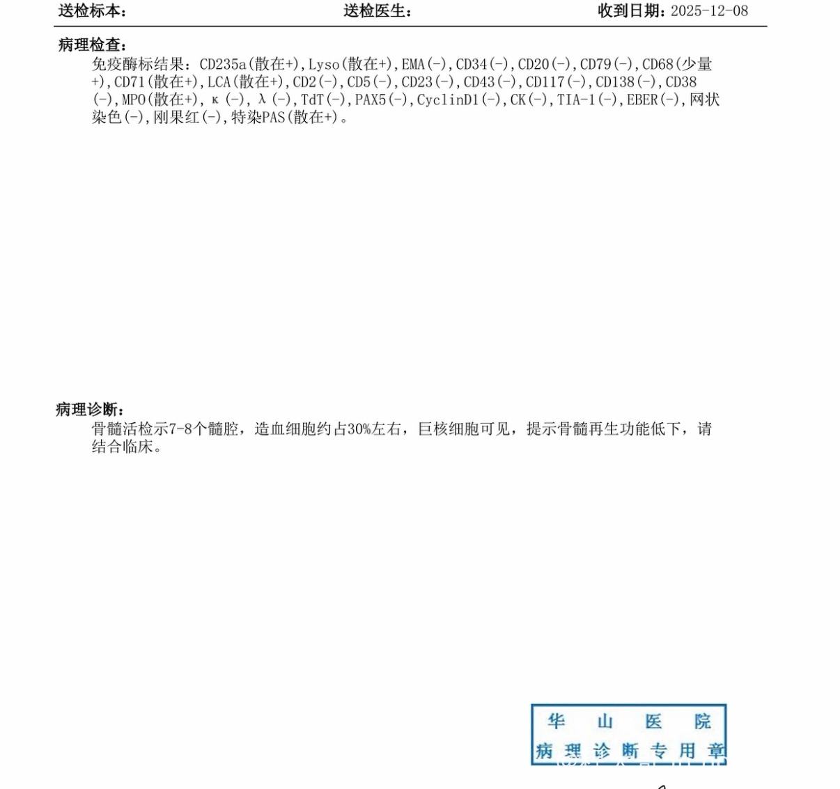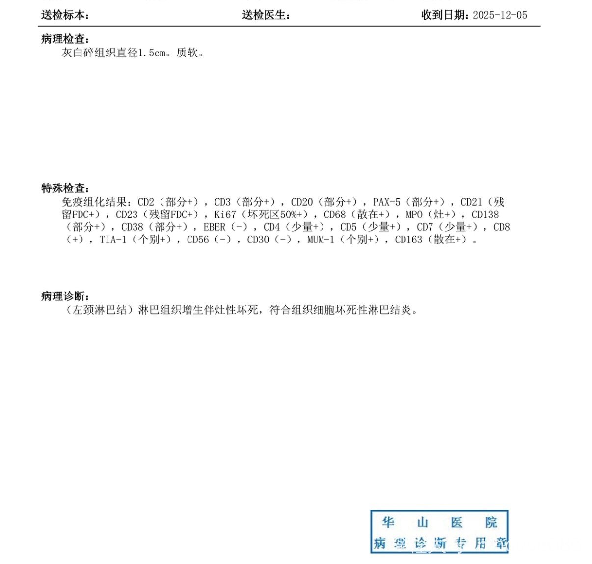 第二天手术在脖子上取了一个淋巴结活检,后面病理结果是坏死性淋巴结炎。第三天骨穿和胃肠镜无明显异常。