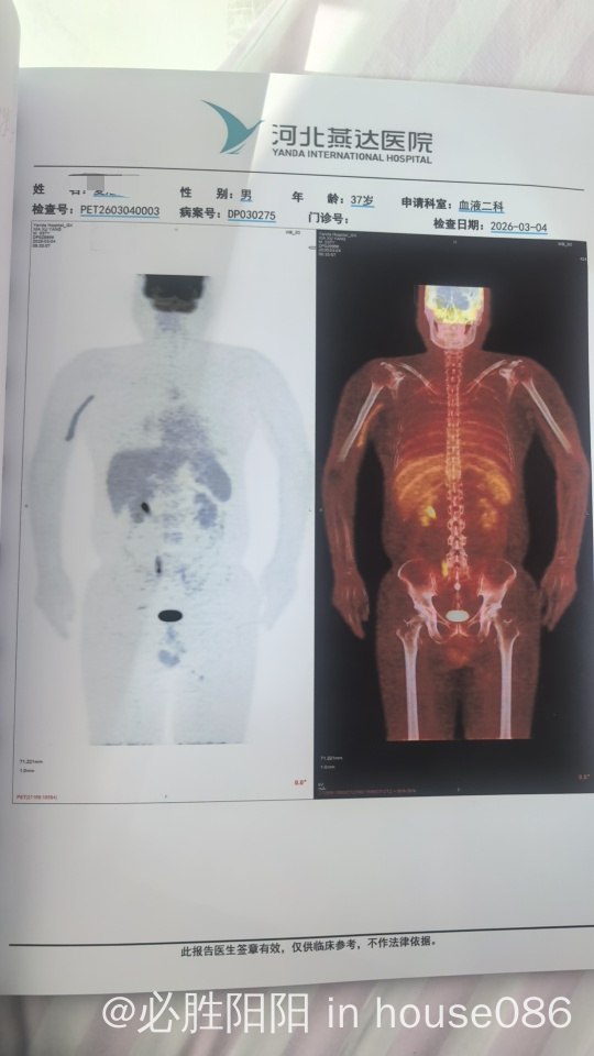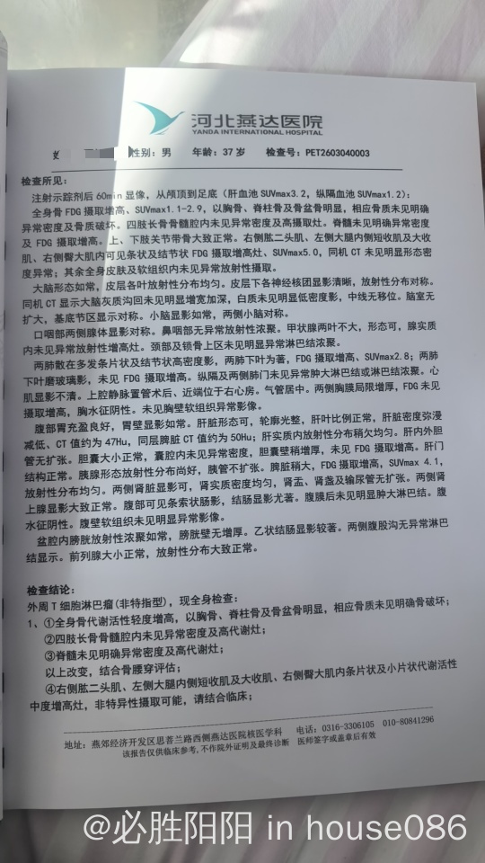 3疗后评估不理想,所以大夫方案在chop基础上加了戈利昔替尼。5疗后因为感染了巨细胞病毒,发烧20天,新发了轻度肺炎,肝脾也有了炎症,大夫为了排查是肿瘤热还是其他原因,让我做了petct,结果如下。其中,左侧大腿suv值为3.5,右侧臀大肌suv值为2.9。大神帮评估下治疗效果是不是cr了,并请指导下后续治疗方案,3疗评估结果在上一个帖子中。