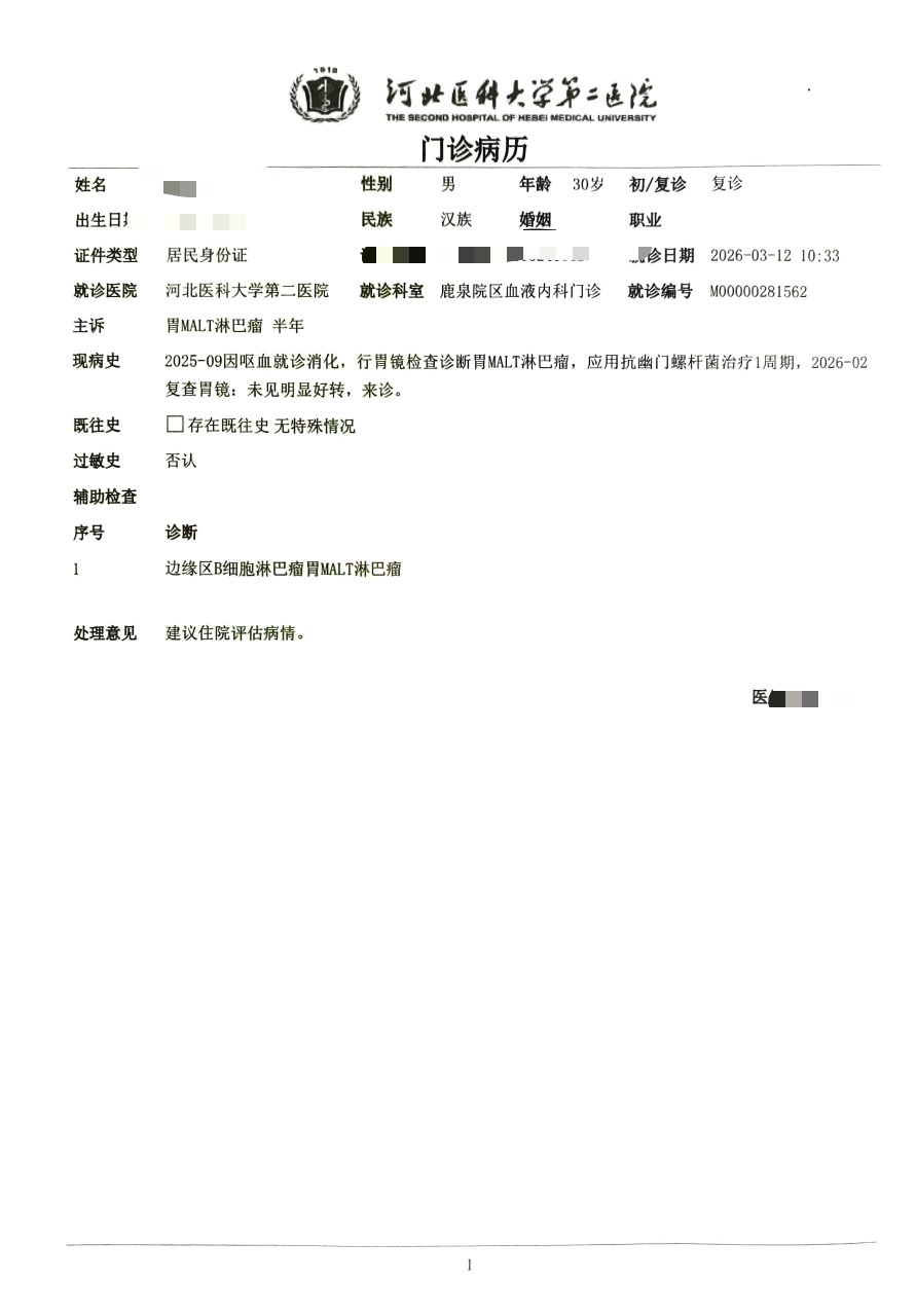 30岁,2025年10月通过胃镜+病理确诊胃MALT淋巴瘤,确诊时HP检测为阴性。随后于2026年2月完成一轮四联抗HP治疗,2026年3月复查HP仍为阴性,但病理活检显示病灶无变化。目前计划前往北京进一步诊疗,拟做PET-CT明确分期,并咨询后续治疗方案,恳请各位大神推荐北京擅长胃MALT淋巴瘤诊疗的医院及专家,同时分享就诊建议,非常感谢