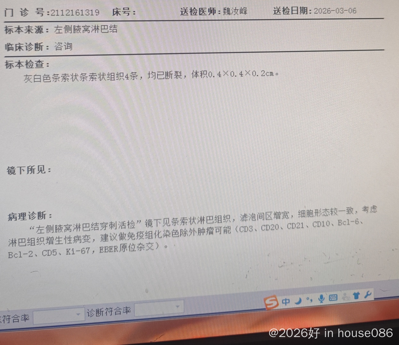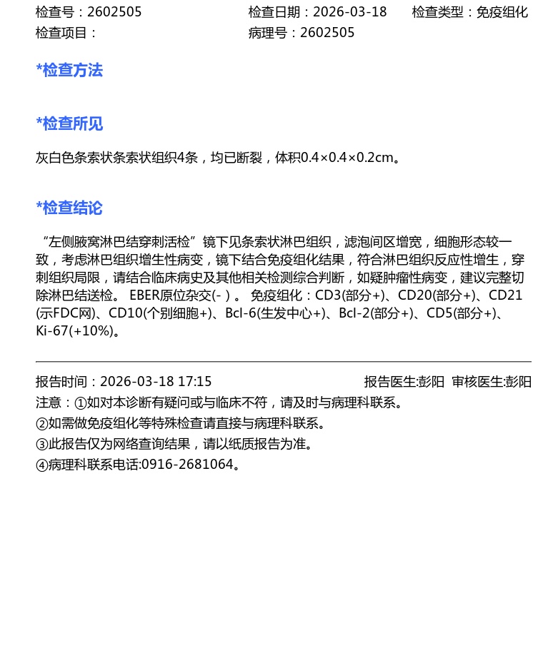 等免疫组化吧,穿刺活检是淋巴结增生。。\n手术切除免疫组化是考虑霍奇金。。。