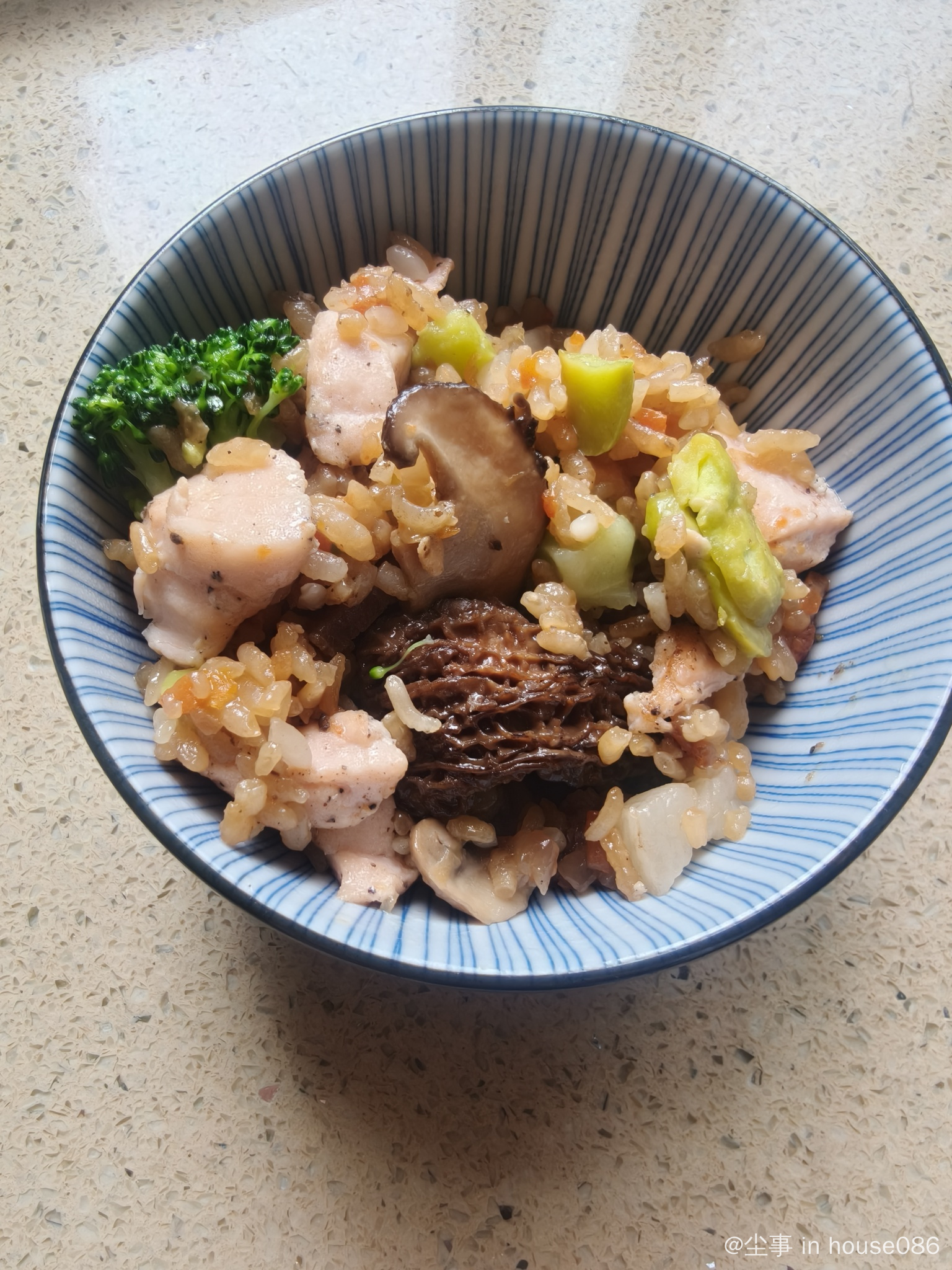 制作方法:先将米浸泡半个小时,同时将洋葱,蘑菇,香菇,胡萝卜,羊肚菌,咸肉翻炒,加耗油,加生抽,再将浸泡过的米放入少量的水和炒过的菜一起焖煮,同时加入蚕豆。在焖煮的同时,把三文鱼用海盐胡椒腌制,锅内倒入少量的油煎熟,等米饭焖煮快好时,再加入三文鱼焖煮2分钟左右,还可以加一些西兰花(西兰花需要焯水至熟以后放入),最后再加一些黑松露酱,一起搅拌均匀。