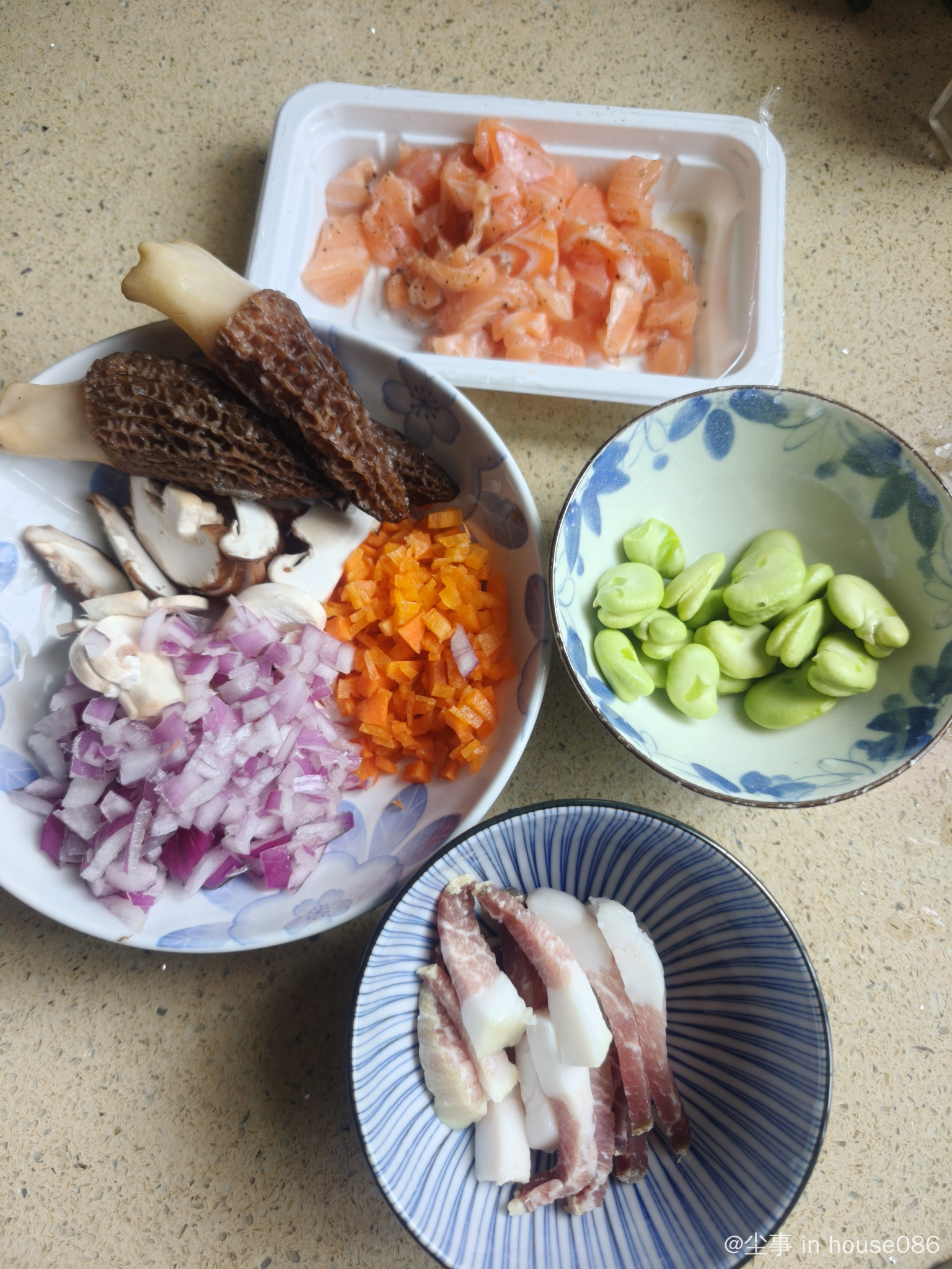 材料:咸肉,洋葱,胡萝卜,香菇,蘑菇,羊肚菌,蚕豆,三文鱼,白米