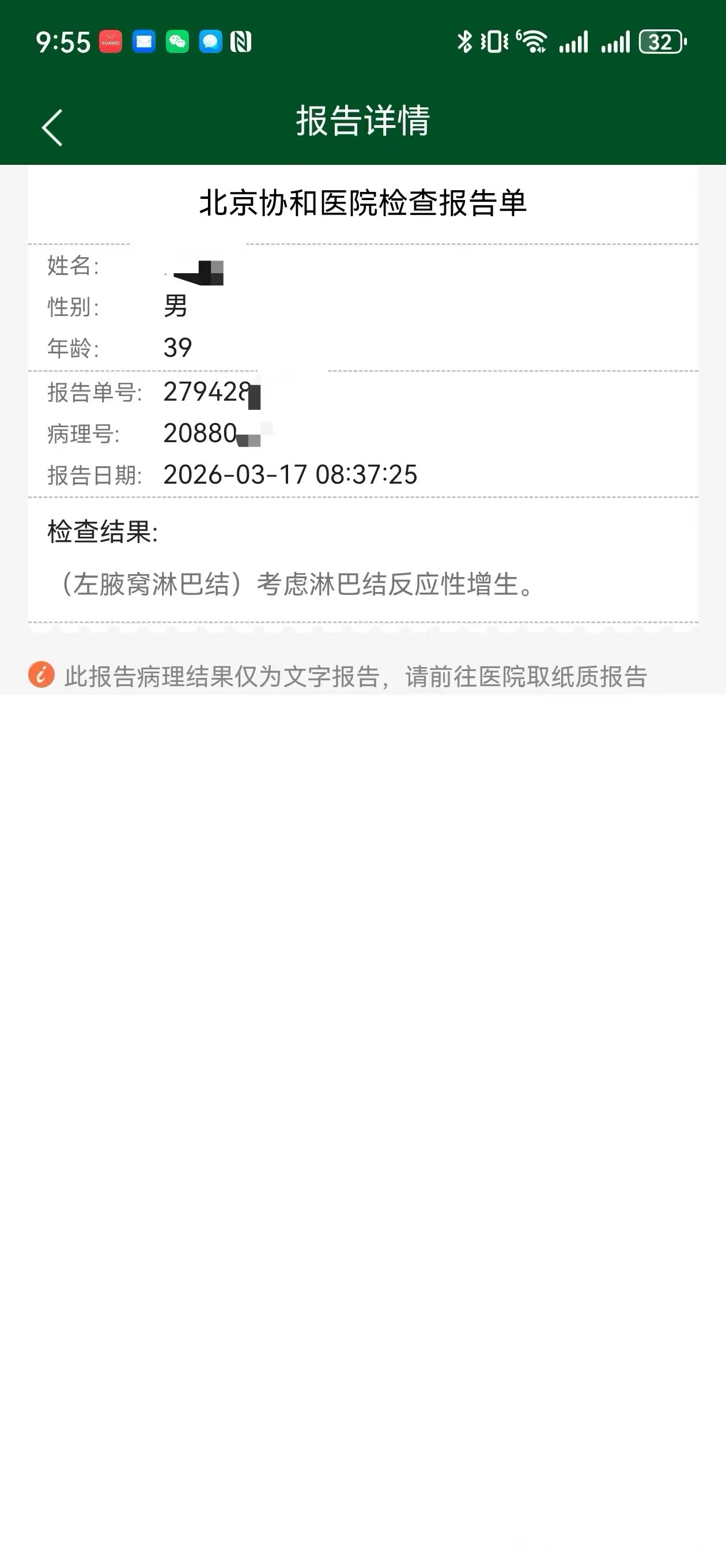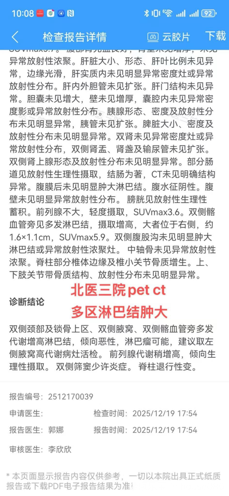 是那个pet ct建议的那个左腋下最大淋巴结,也是最初穿刺那个,这次全切的时候,术后医生说几个大的融合在一起或者紧密挨着,摸起来感觉很大,不像只有两厘米多,就一整块切下来了,整块一起有5厘米左右,应该是有那个最大的在里面的吧