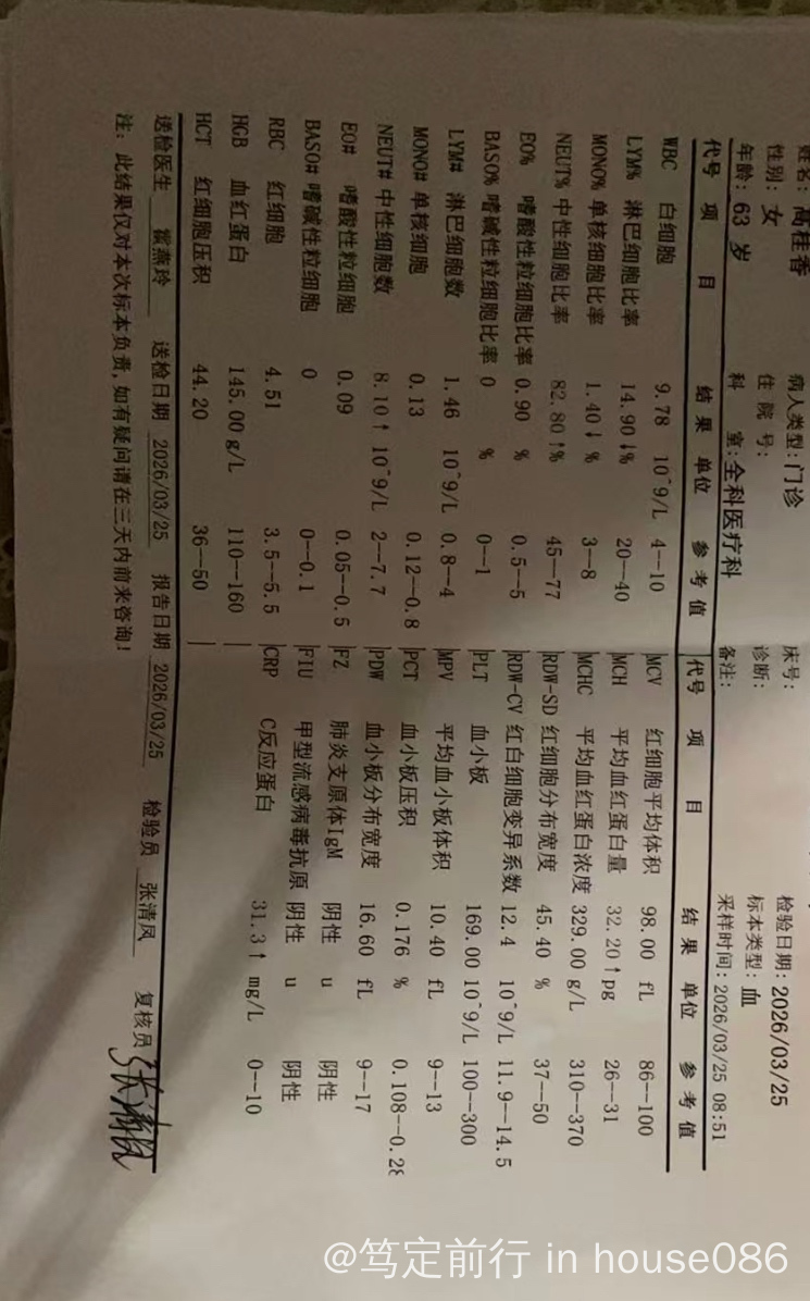 第二天早上7点40分从家出发来到社区卫生站,开了血常规+C反;肺炎支原体IgM及甲型流感病毒抗原,结果还算不错,C反31.3略高,只要不是甲流就好,开了一大堆药回家了。