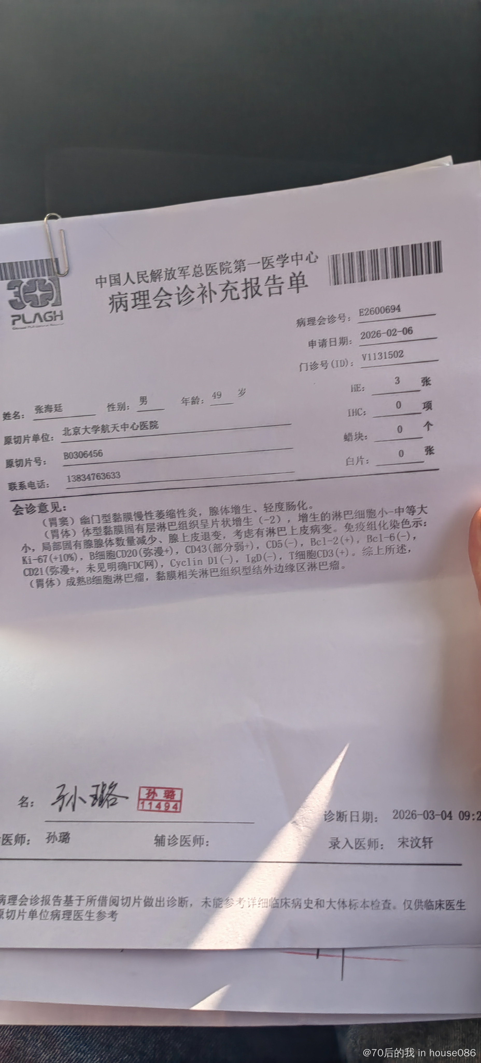 病理报告胃部malt淋巴瘤