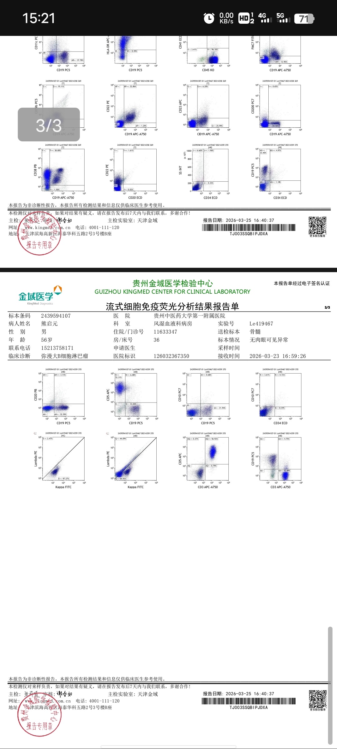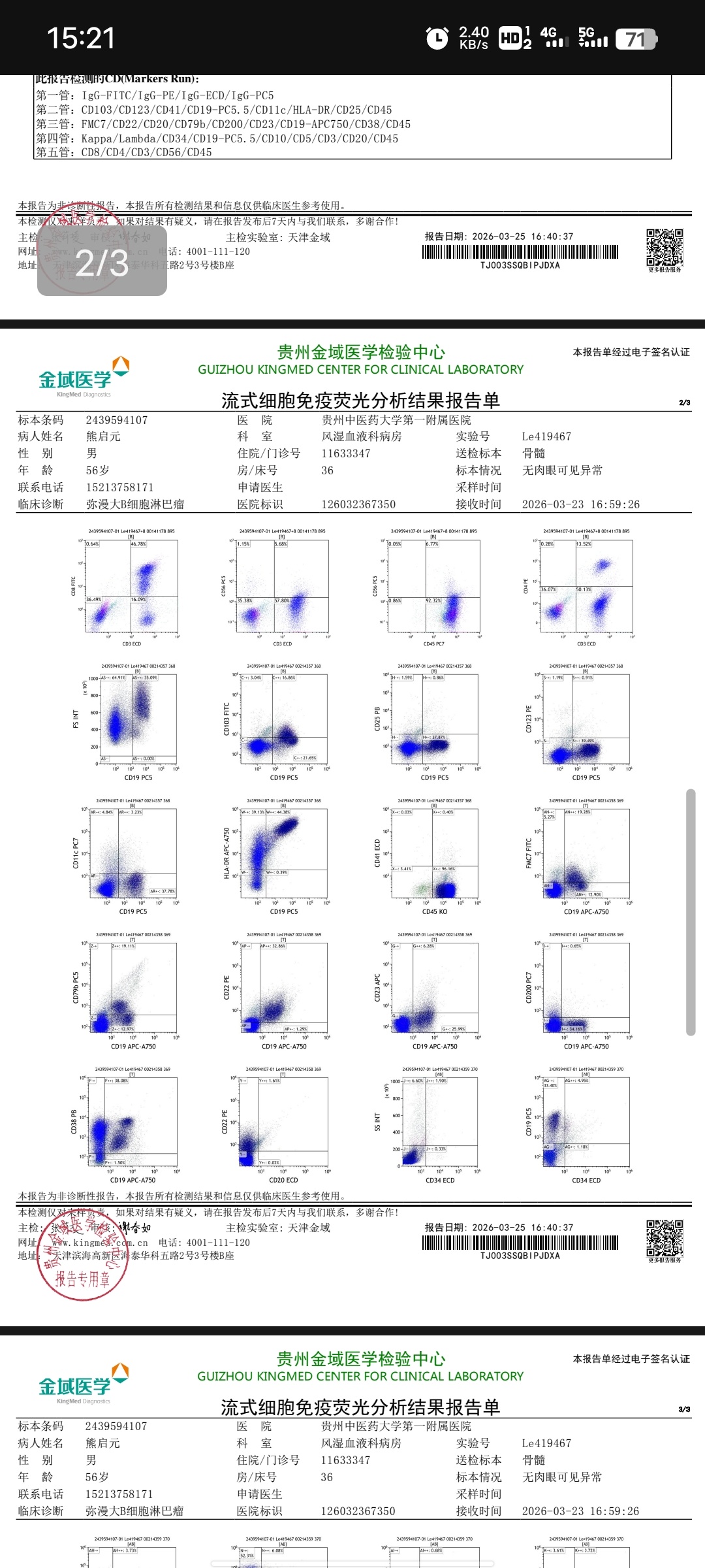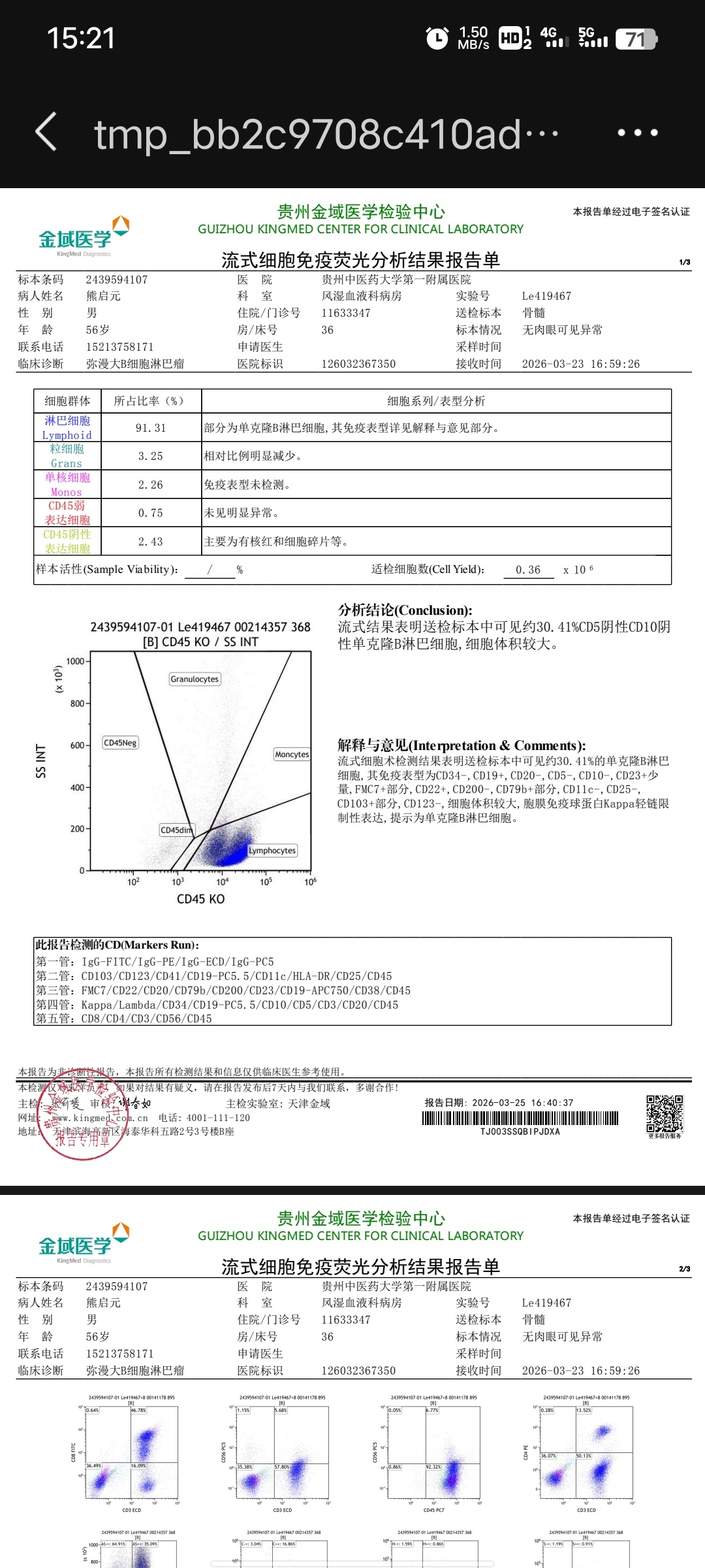 1. 骨髓流式:检出 30.41% 异常单克隆大B淋巴细胞,提示肿瘤侵犯骨髓。