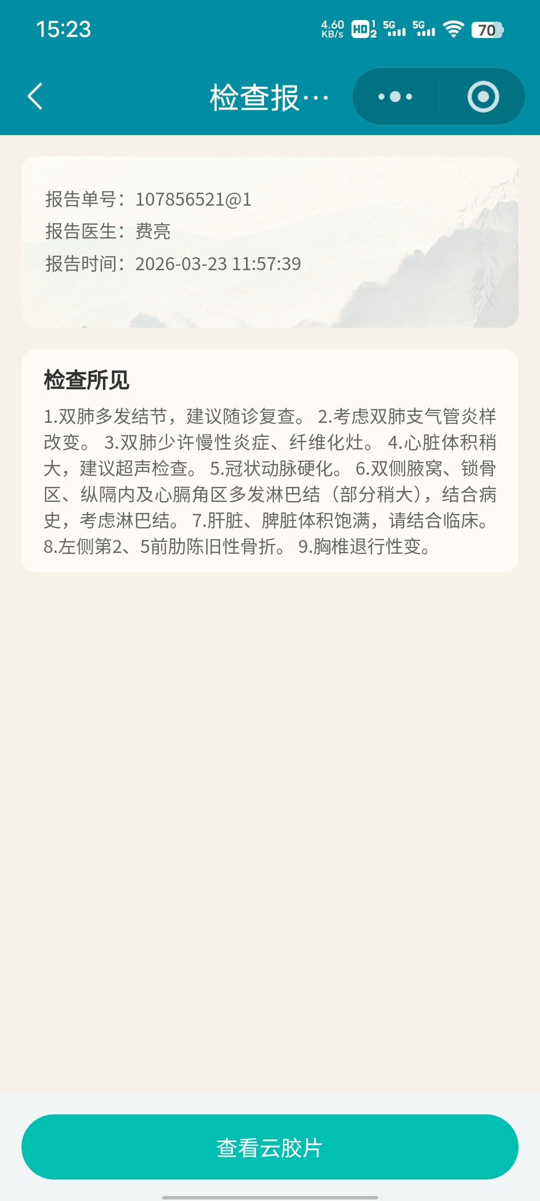 • 冠脉硬化、心脏稍大、胸椎退变、陈旧性肋骨骨折(基础病变)
