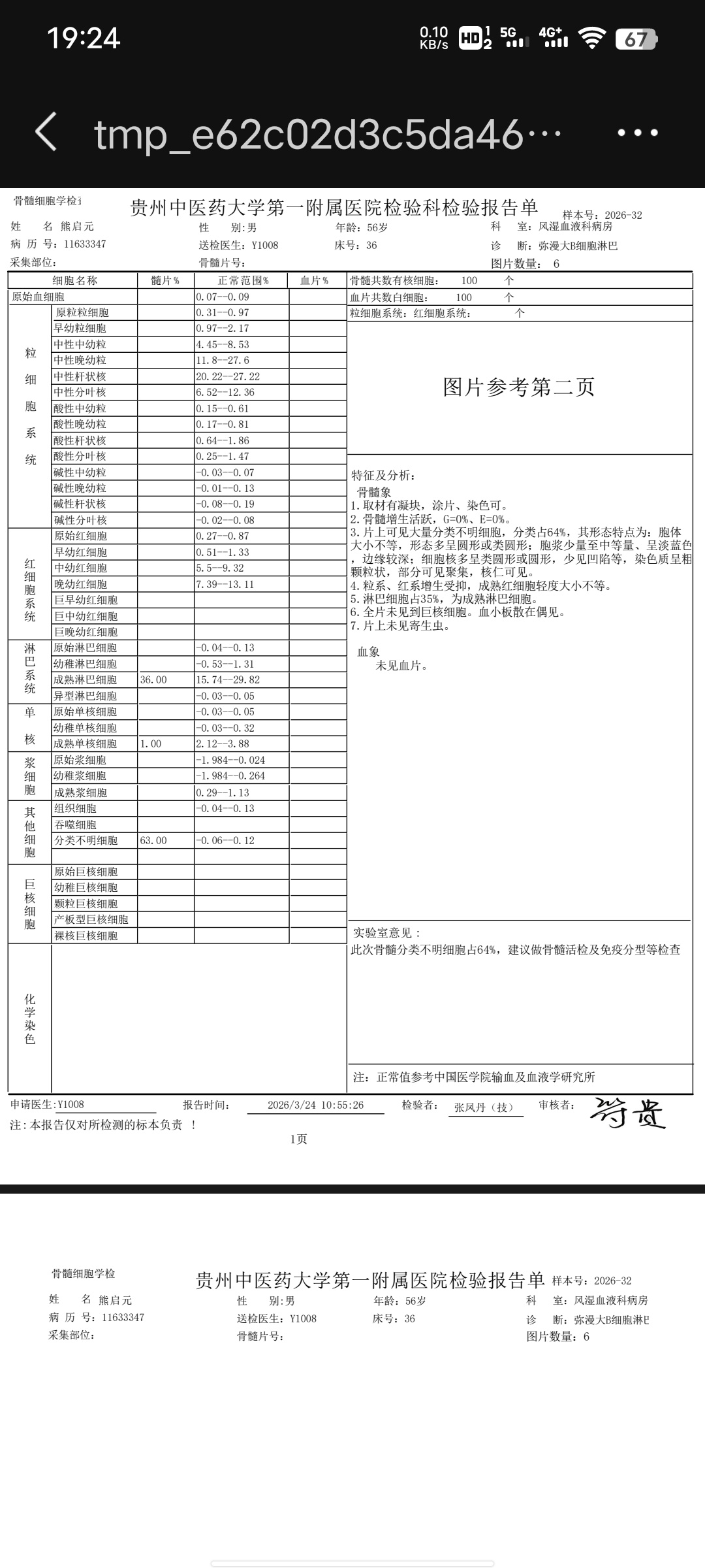 56岁男性,原发纵隔大B细胞淋巴瘤复发,明确诊断弥漫大B细胞淋巴瘤,已累及骨髓。