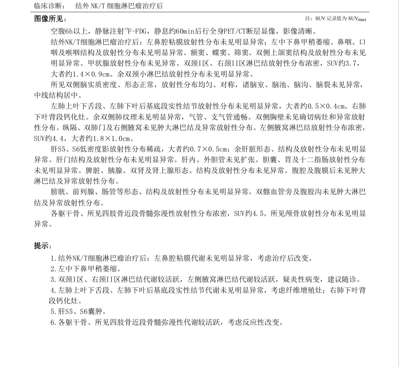 我自己觉得,这大概率没事吧。如果是转移,SUV起码10以上吧。而且NKT的转移,几乎百分百EB病毒会阳性。反正各方面看都不像。但问题就是为啥这淋巴结就增大了…