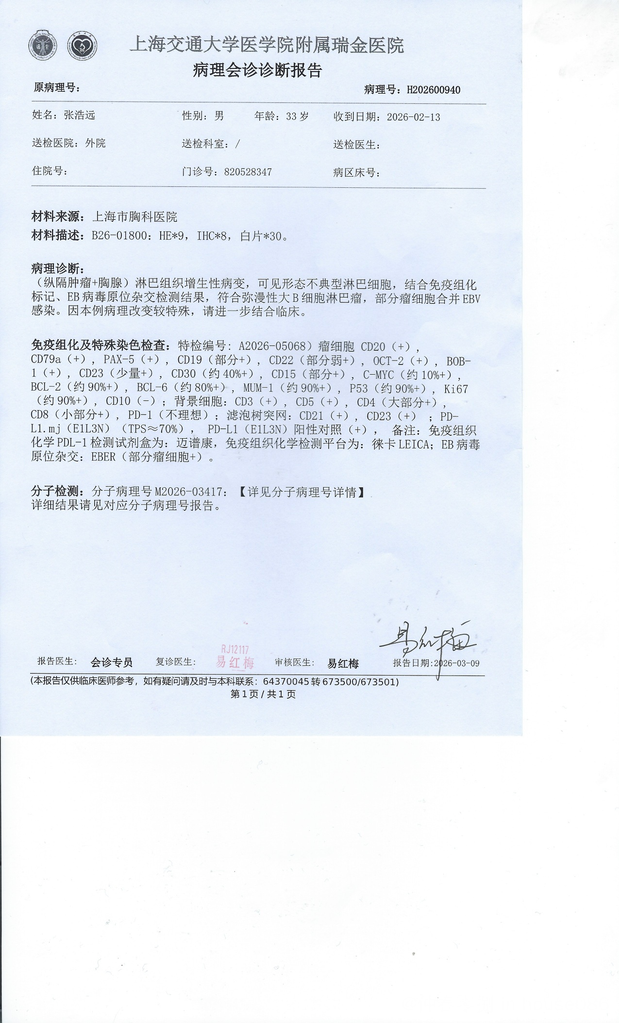 朱利安 发表于 2026-03-31 15:20 瑞金的病理报告上很明确大B,你又切除了病灶。IPI是0,非常低危,预后应该很好。