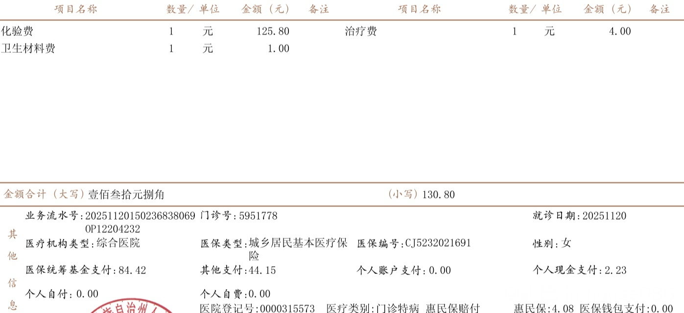 以我在公立三甲做一次血常规和肝肾功能检查为例,总费用130元,报销后我个人支付了2.23元。