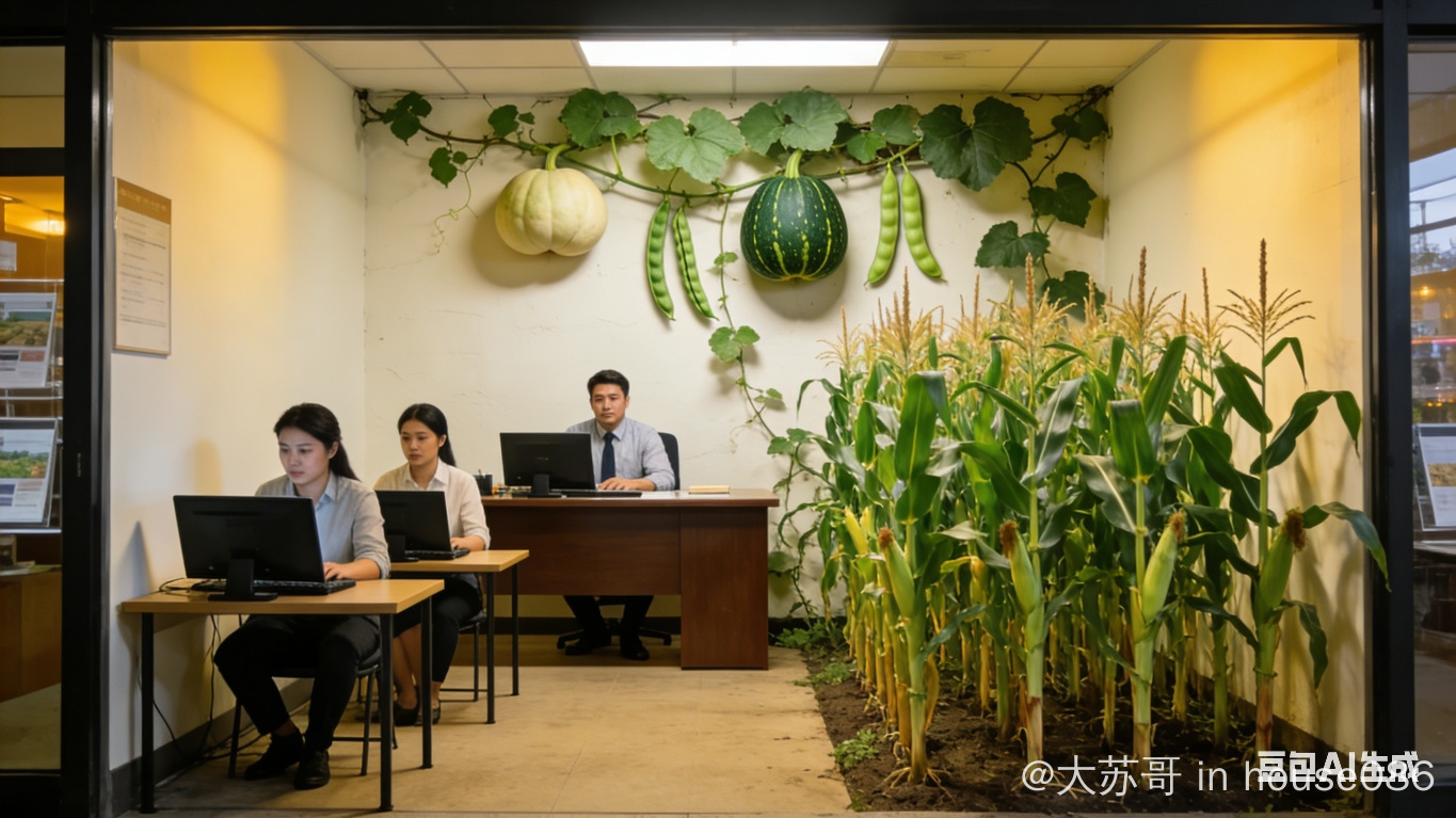 在我工位的左侧,长着一排长势旺盛的玉米,绿油油的嫩株挺拔精神,还没完全成熟,却透着满满的生机,看着格外喜人。我身后靠墙的地方,从墙壁里长出了长长的藤蔓,藤蔓上结着细细的豆角,像筷子一样细长,密密麻麻、长势繁茂;藤蔓上只结了一个圆滚滚的角瓜,个头只有大馒头那么大,青嫩饱满,也还没完全长大。