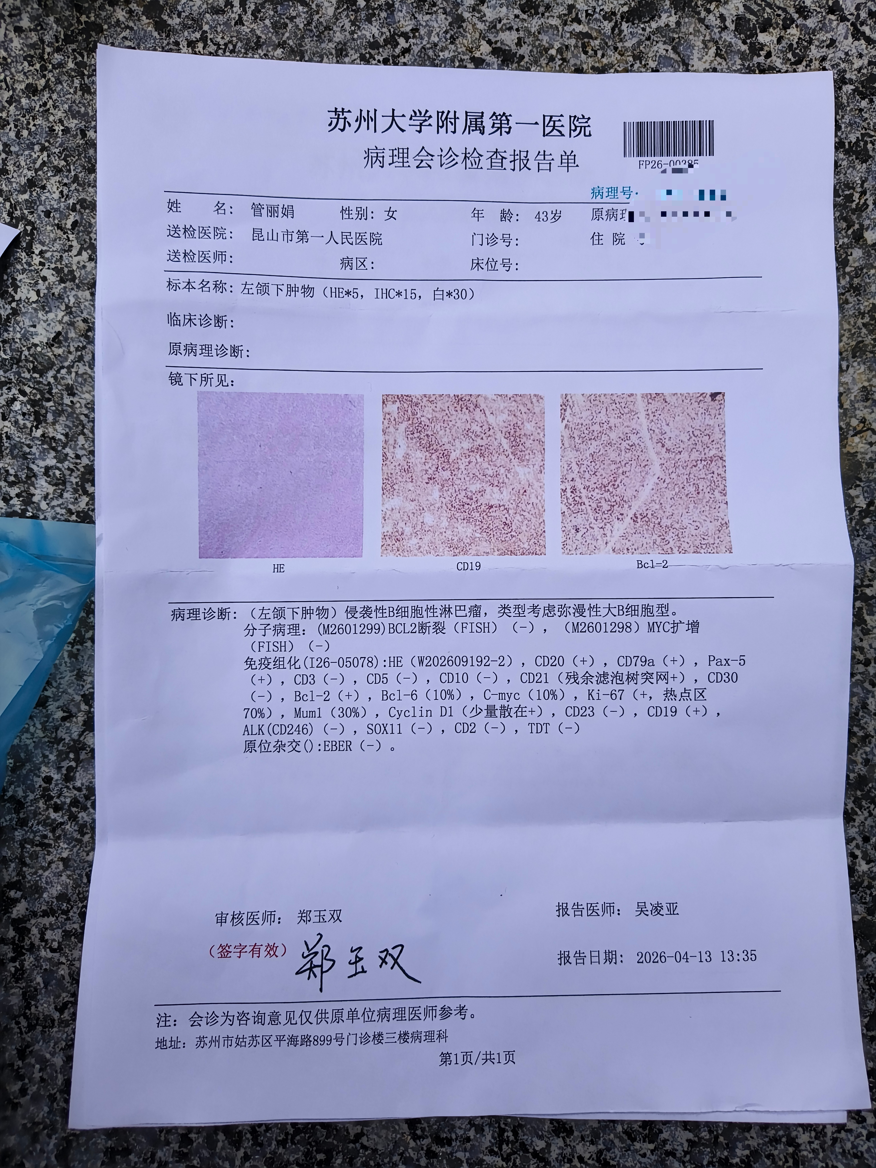 叮铃铃 发表于 2026-04-10 07:58 想啥呢,如果是弥漫大B,不治疗,生命按月计算。治疗的话,5年生存率,60%—90%不等 另外,病理上只说是B细胞恶性肿瘤,中级别。没说是弥漫大B,KI67 40%也不太像弥漫大B,建议找医生问清楚情况,淋巴瘤的分类非常多,明确类型才能针对治疗。 总之加紧时间快确诊分型,快治疗,不要浪费任何时间