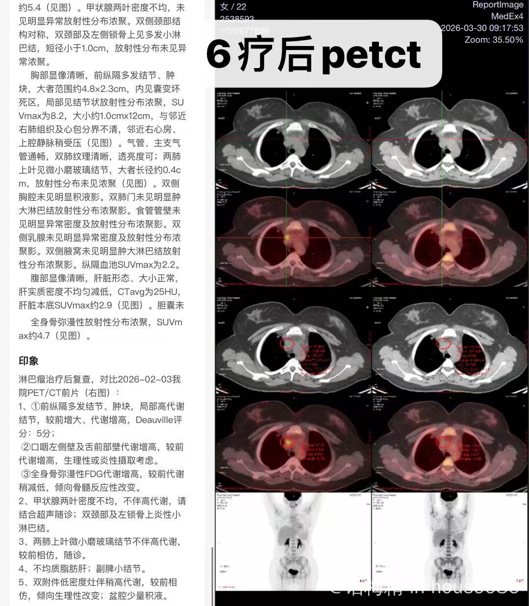 · 6疗后PET-CT(3.30):主体 4.8×2.3cm(坏死为主),内见 1.0×1.2cm 实性结节,SUVmax 8.2,Deauville 5分
