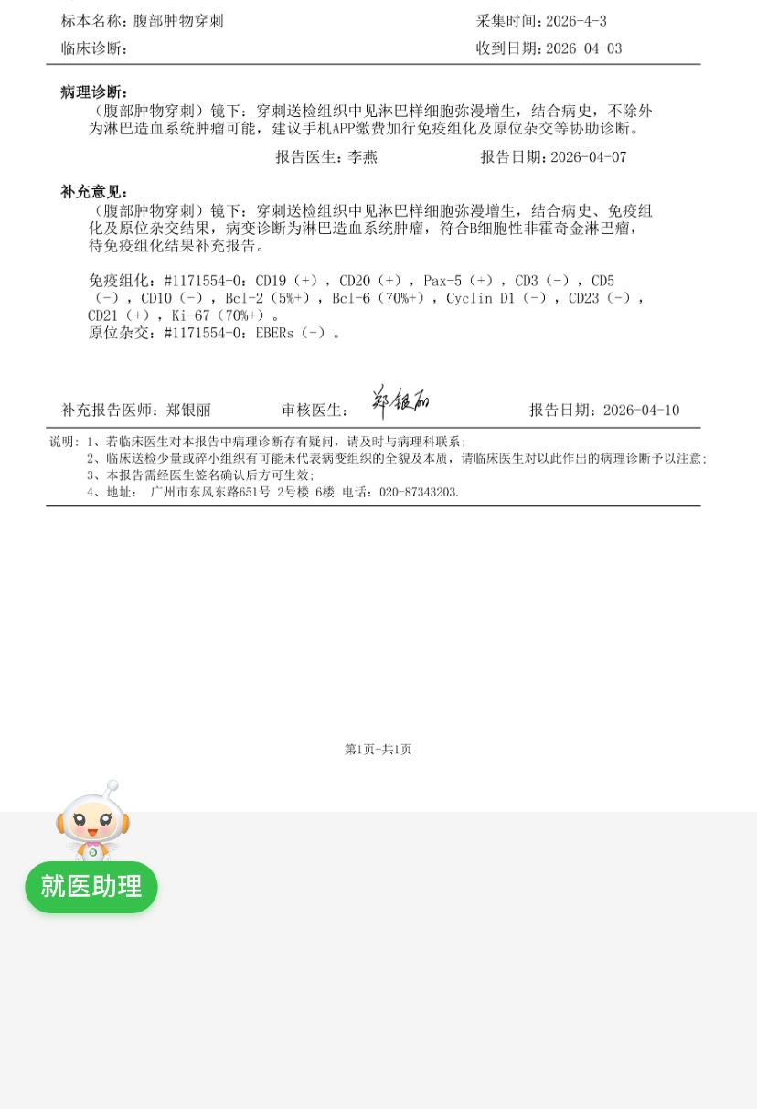 南胖 发表于 2026-04-11 09:33 cd10,eb都阴性还好。中肿的病理也是慎重。周一可以去找主治了,商量下能不能先打一次化疗,一边等结果,再补充免疫组化,基因重排,二代基因等报告。毕竟吸收有点高,弥漫大b某个亚型可能性大了。