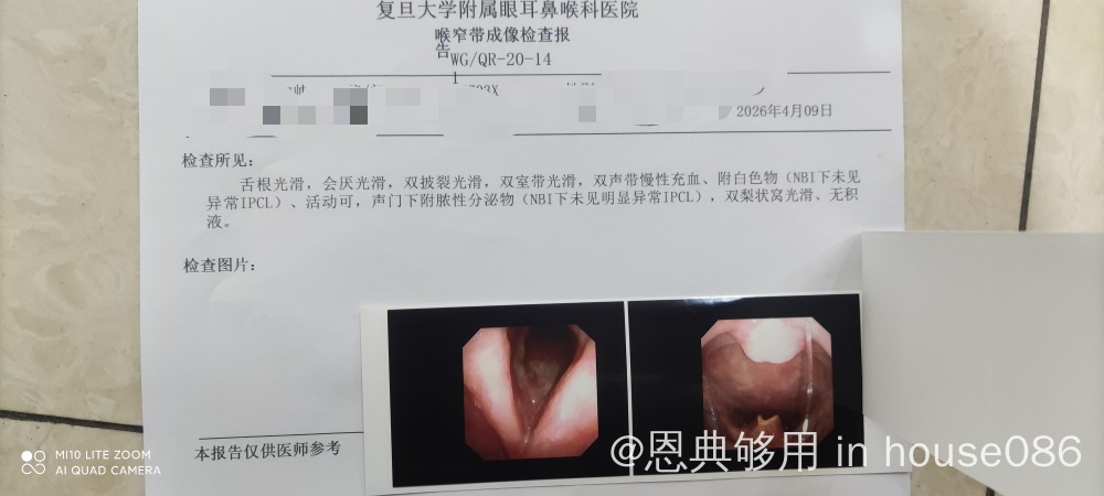 声音嘶哑十余天,不放心,又跑到医院做了检查,医生说没问题,开了点消肿利咽的药!