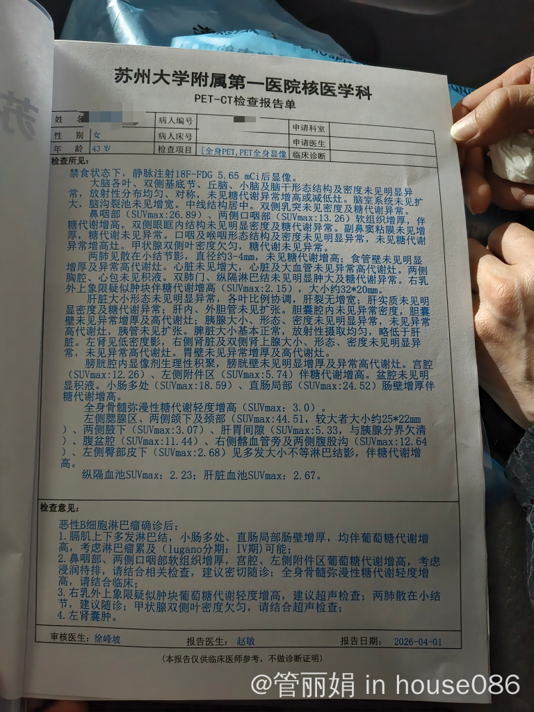 淋巴瘤是病情程度是看IPI评分的,分期只是其中1分的。看PETCT 你的IPI应该在2-4之间(年龄0,分期1,节外1,乳酸脱氢酶和体能不知),但40多岁,只要能自理,体能也是0,所以IPI大概率2-3分(中低 到 中高危),并且无双表,双打,病理层面就是比较常规的大B,没你想的那么危险。不过你有不少节外受累,需要考虑中枢预防。肿瘤代谢比较高,要抓紧时间治疗。加油 |