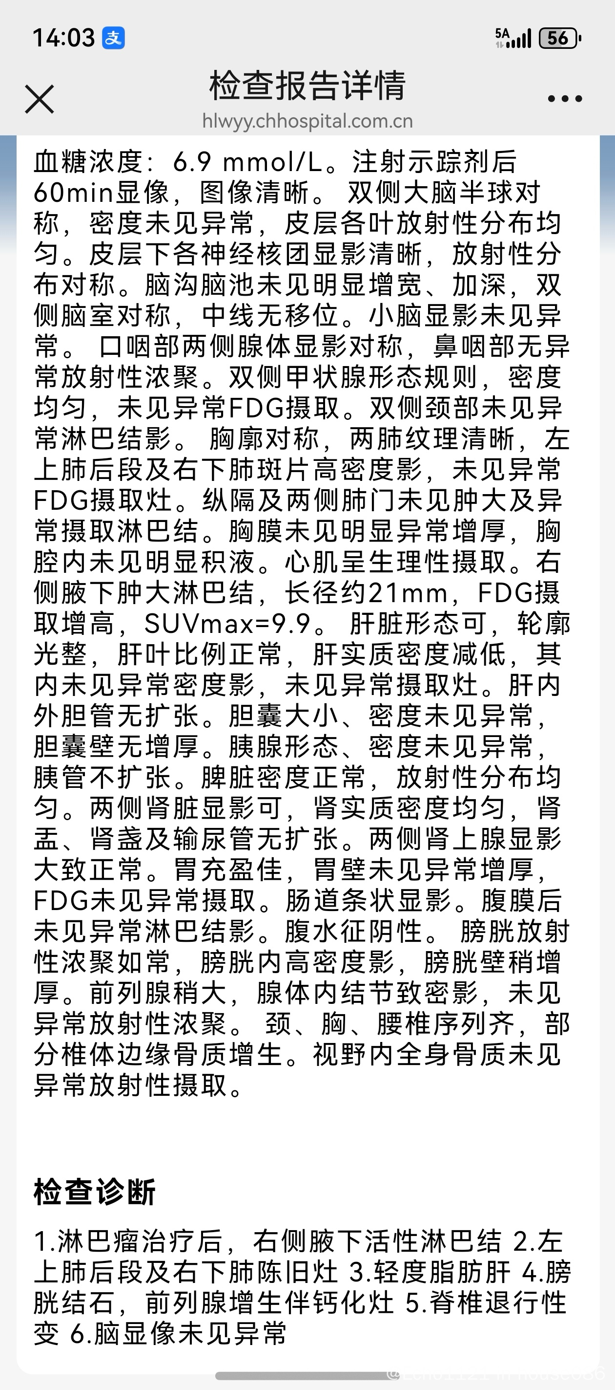 前几次复查都没什么问题,这次复查两侧腋下都见到一个肿大的淋巴结,做完pet发现右侧的suv很高,这是复发了吗,已经约了再去穿刺做病理,心里很忐忑