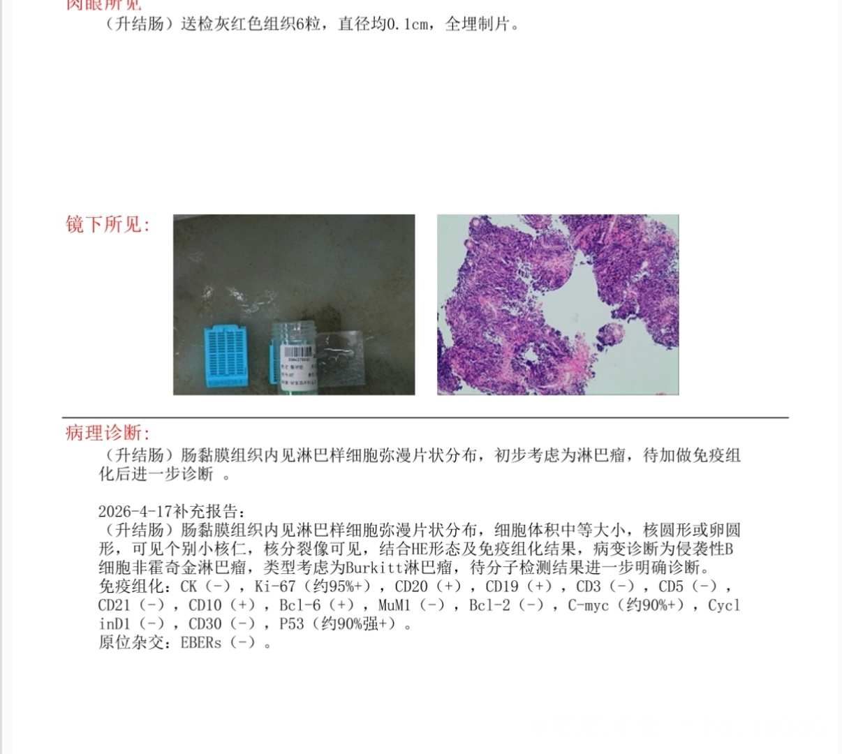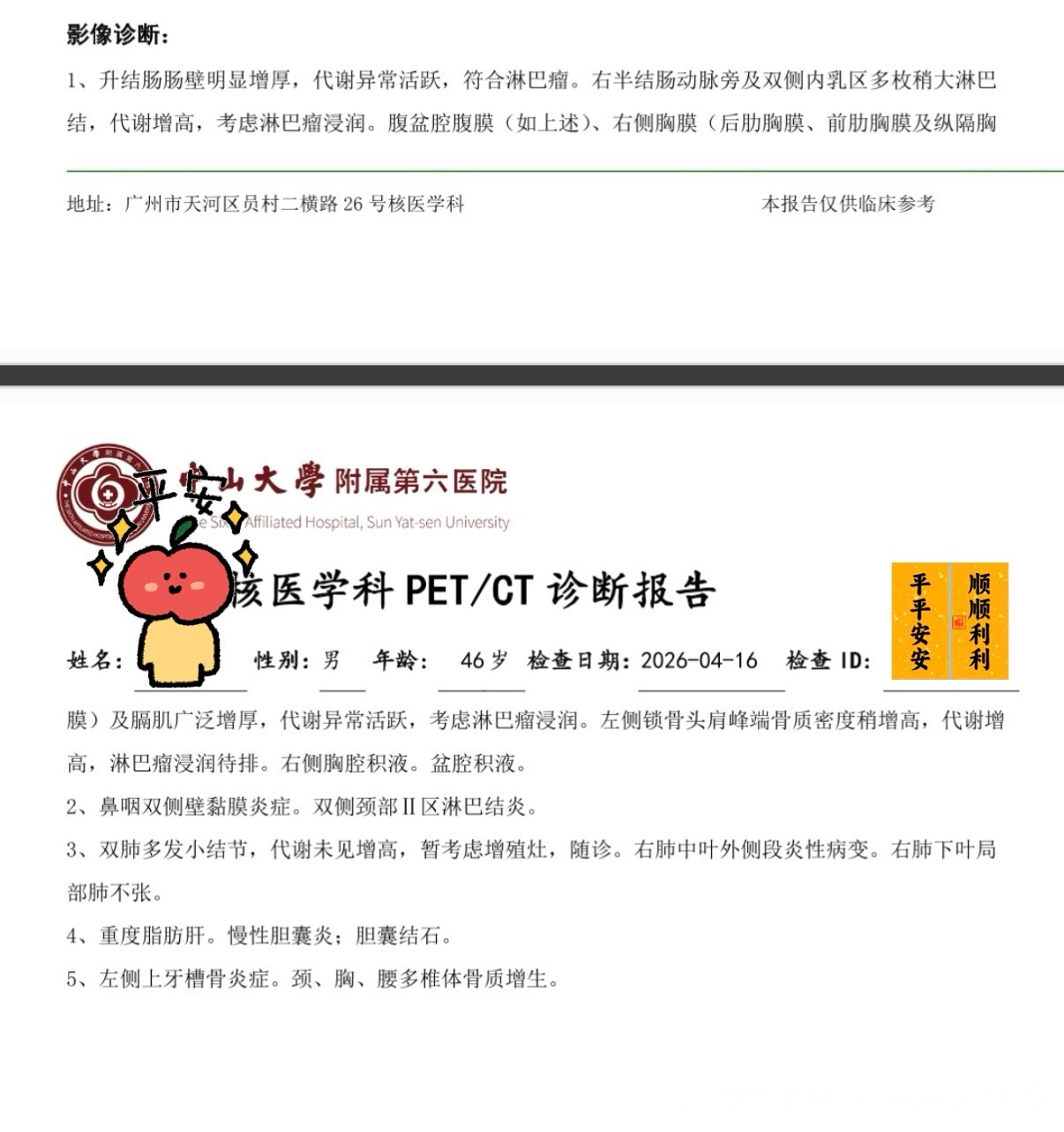 然后我们立刻在中六入院做了病理免疫组化和petct,昨天病理结果出来说是淋巴瘤,我就在中肿先挂了个李志铭医生的号,还有前两天照彩超发现爸爸右胸有胸腔积液抽了三天,第一天抽了250ml第二天500ml今天说200ml就好了,但现在看着抽不出来多少了。今天免疫和petct都出来了,我真的好害怕。