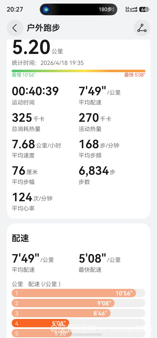 晚上出门跑了3公里超慢跑+2公里提速跑=5️⃣公里。最近一段时间的控心率有氧慢跑还是有效果的,后2公里提速也蛮快的都是不到5分半配速,继续加油
