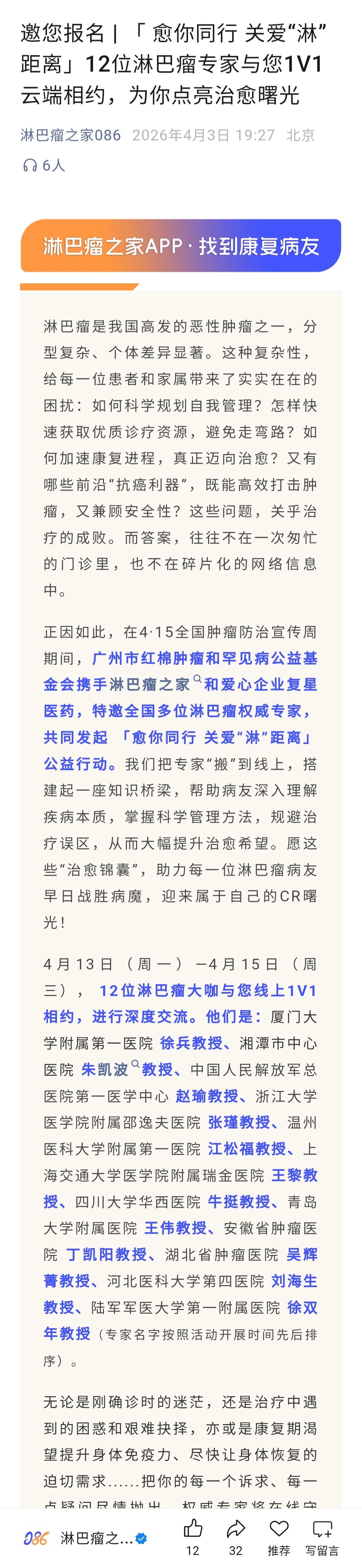 淋巴瘤之家4.13~4.15线上义诊活动