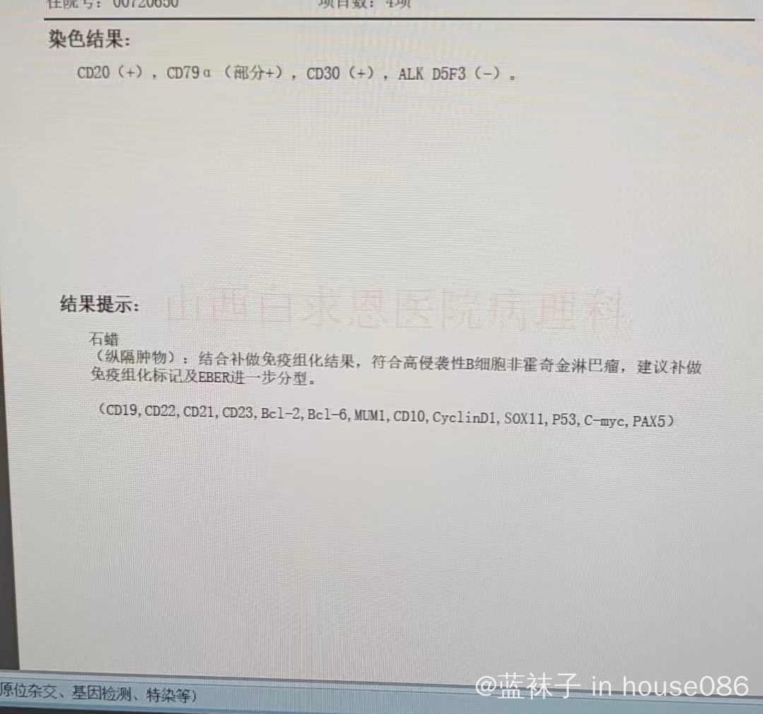 血研所那边可以找邱录贵,邹德慧,刘薇几位主任,免疫组化需要尽快补做一下,可能是个原发纵隔大B,团泊院区周二上午有大B专科门诊